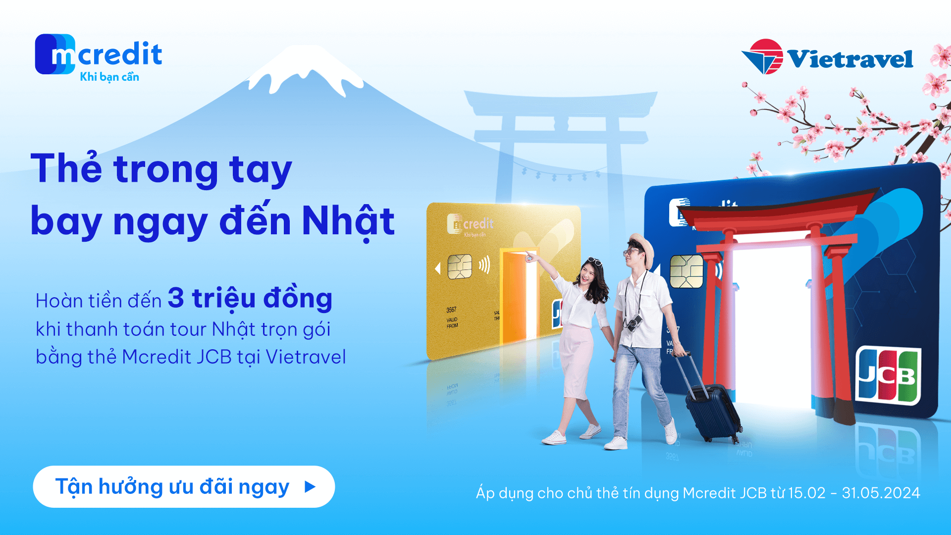 Theo đó, khi thanh toán tour du lịch Nhật Bản trọn gói bằng thẻ tín dụng Mcredit JCB tại Vietravel, khách hàng sẽ nhận được ưu đãi hoàn tiền lên đến 3 triệu đồng.
